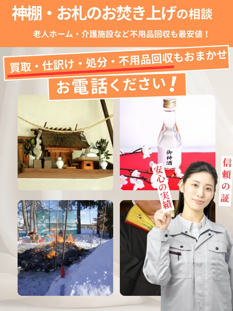 | 事業内容 | 神棚・お札のお焚き上げ代行 遺品整理・生前整理 空き家片付け・残置物撤去 不用品買取・リサイクル |