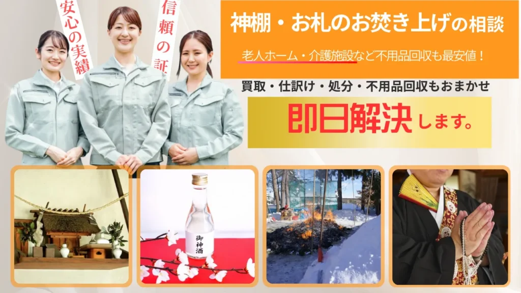 環境に配慮し、お焚き上げまたは適正な方法で処分いたします。作業完了後、その場でご精算となります。