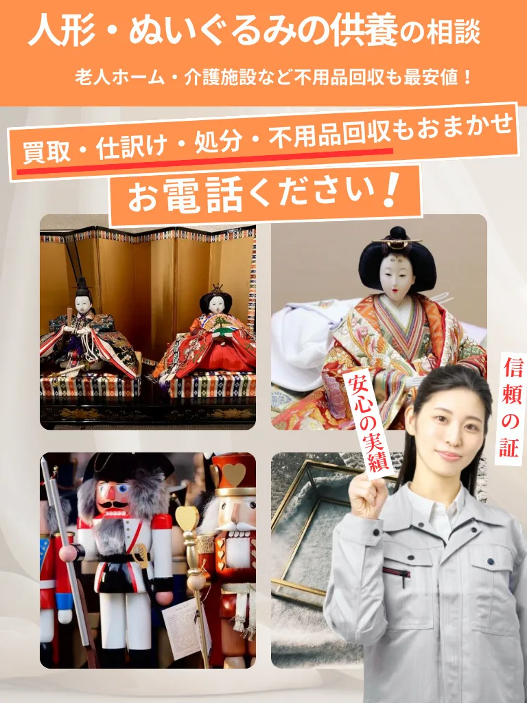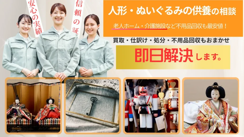 私たちは、皆様が大切にされてきた人形やぬいぐるみを、ご自宅までお引き取りに伺い、責任を持って供養・処分いたします。